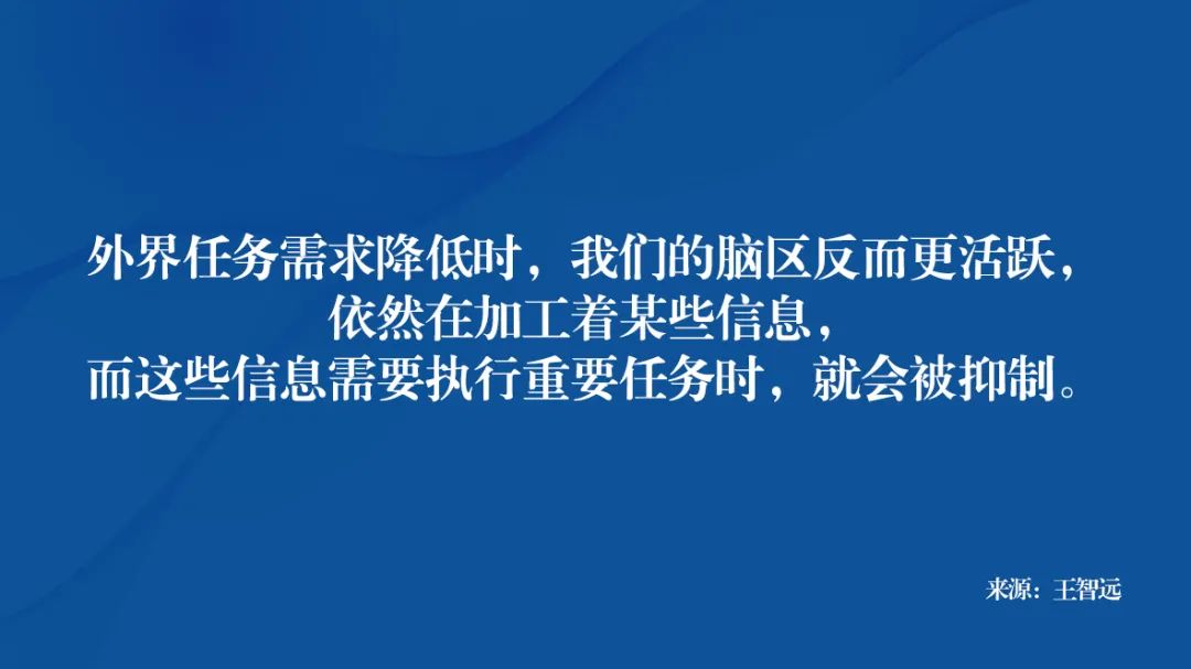 研究认为默认网络下, 外界任务需求降低时,我们的脑区反而更活跃,依然在加工着某些信息,而这些信息在需要执行重要任务时,就会被抑制,这和心智游移活动相似,因为两者被自然联系在一起。