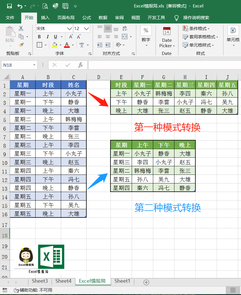 如果我们要转换为模式2格式 , 即以星期为纵坐标,时段为横坐标维度。