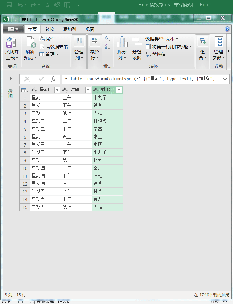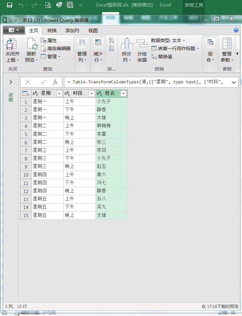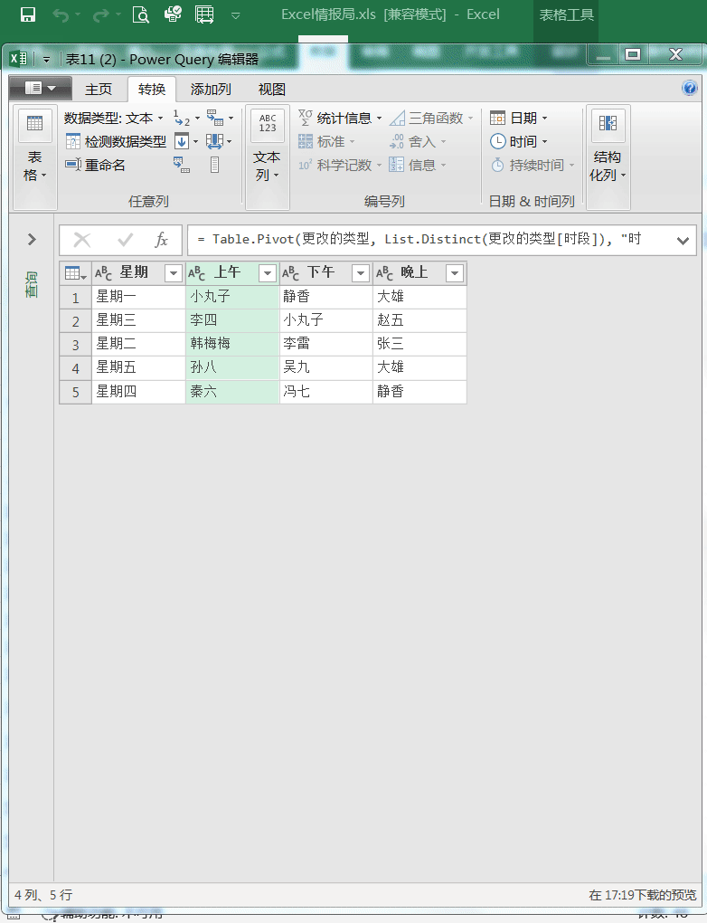 只要选中“星期”列,然后点击“转换”选项卡下面的“透视列”功能,弹出“透视列”的对话框。