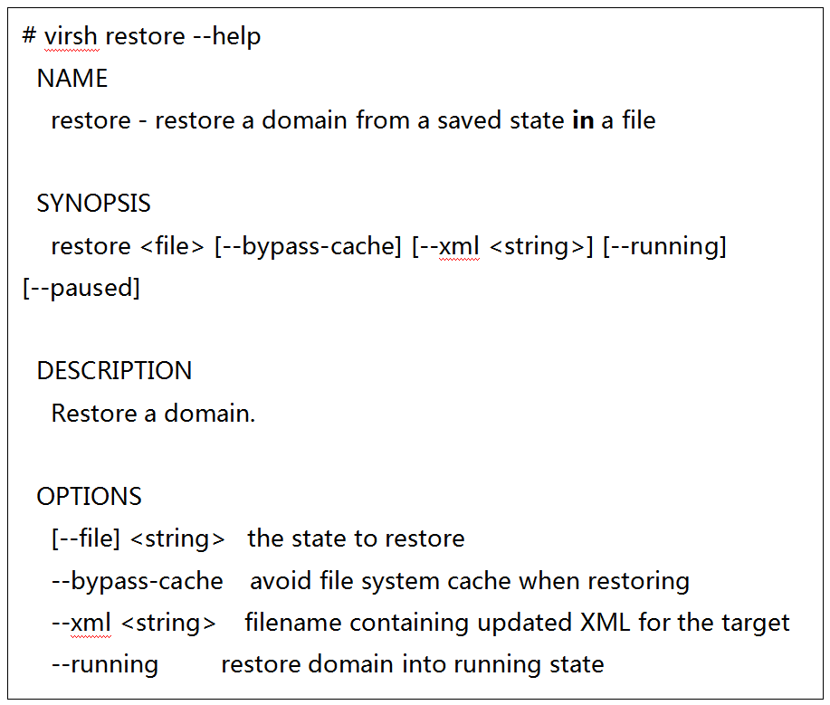 ZStack Cloud内存快照主要基于Libvirt接口实现,我们可通过virsh命令的帮助信息了解相关参数。