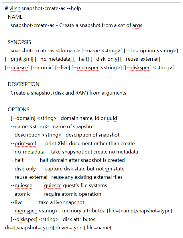 ZStack Cloud内存快照主要基于Libvirt接口实现,我们可通过virsh命令的帮助信息了解相关参数。