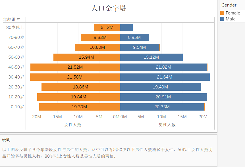 仔细理解下,尽管图表中看起来是分开了男女两部分图,但其实这个图表中人数是一个整体,只是根据性别进行了分类而已。