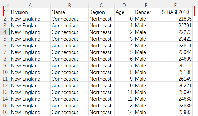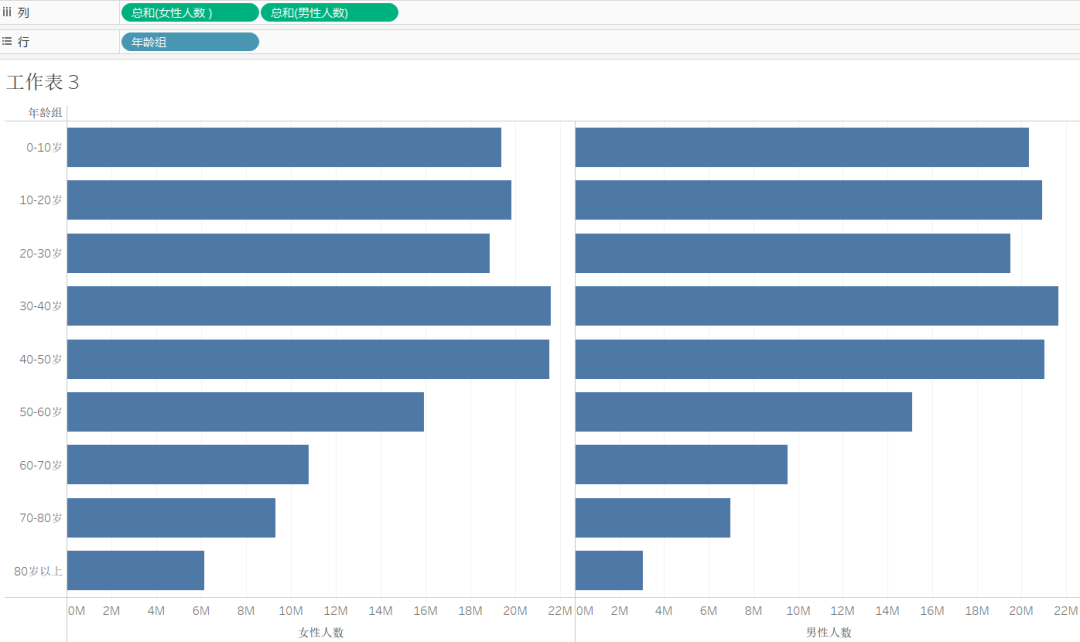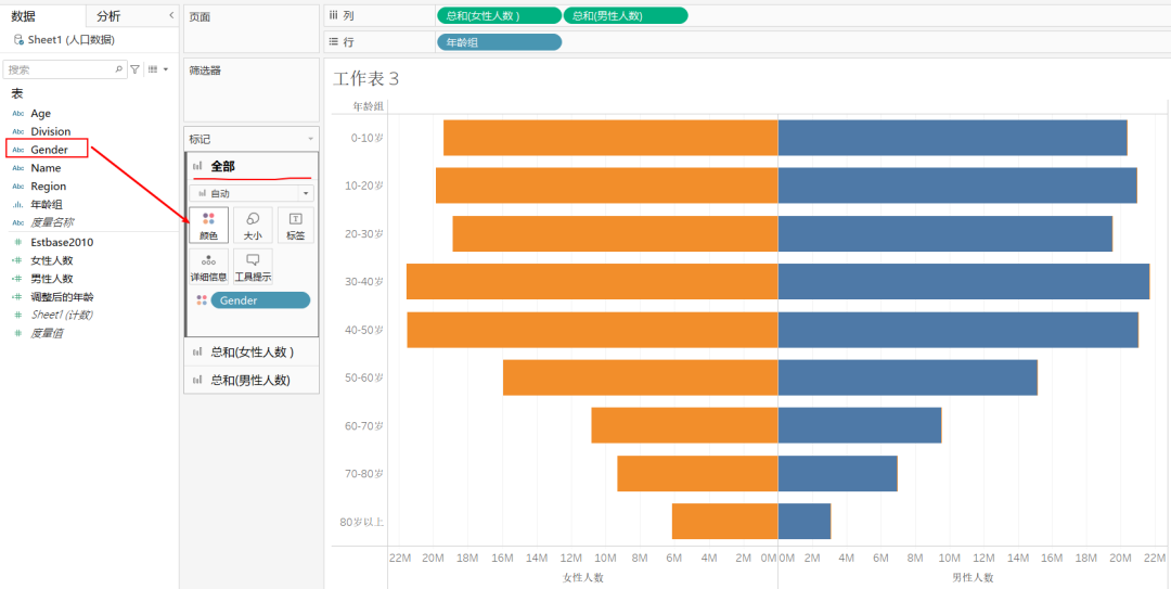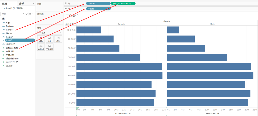 言归正传,本节的重点是在Tableau中如何做这个人口金字塔图。 原始数据字段如下:
