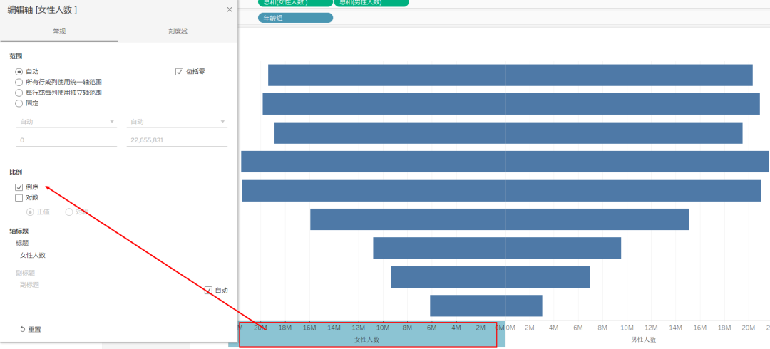 可惜的是,当我们选中人数这个轴,点击倒序时发现,男性和女性的顺序都给倒过来了。