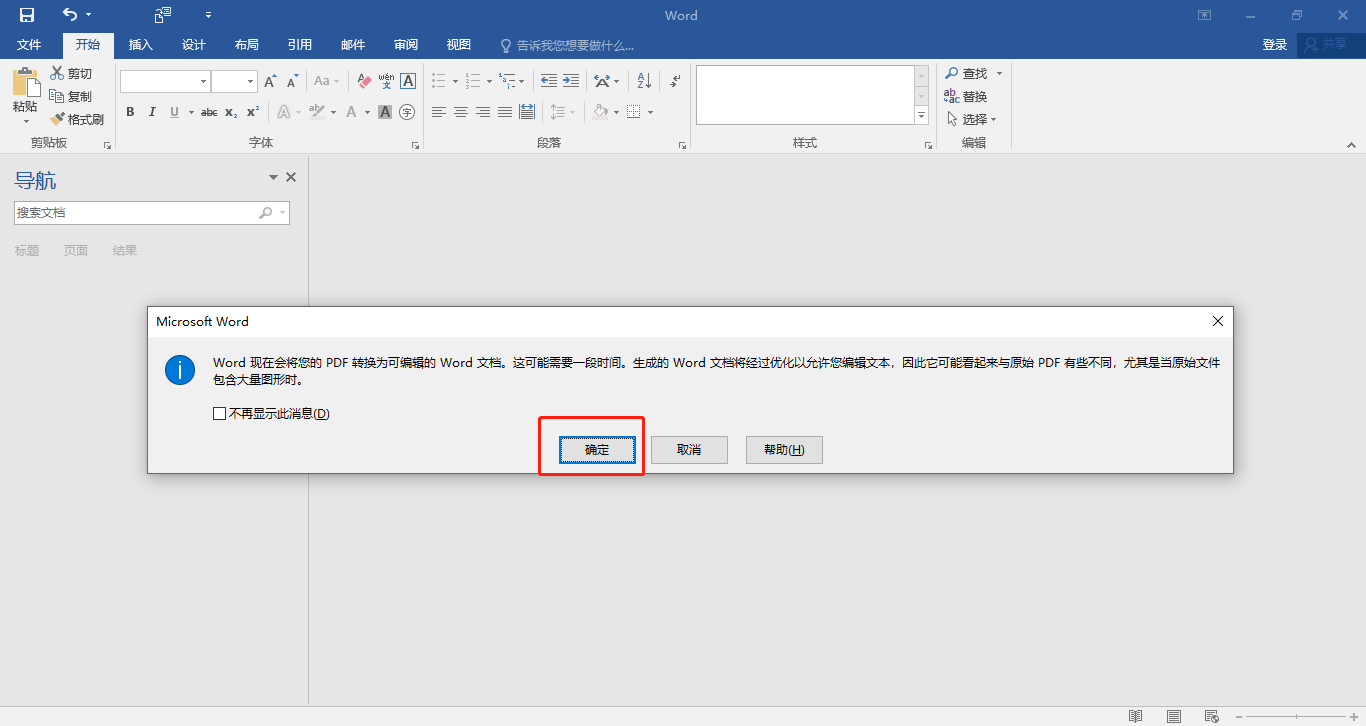 这个时候 Word 会友情地提示你,它正在努力地转 Word,但转换之后可能会和 PDF 有点差异,最后点【确定】即可。