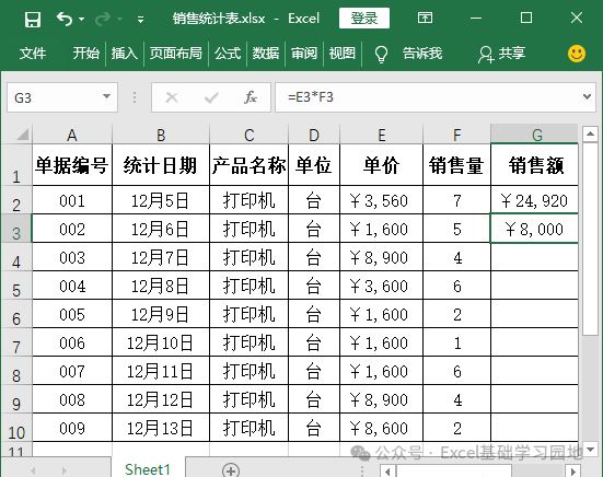 然后将公式复制到下方的G3 单元格中,则G3 单元格中的公式会变为【=E3*F3】。这是因为E2 单元格相对于G2 单元格来说,是其向左移动了两个单元格的位置,而F2 单元格相对于G2 单元格来说,是其向左移动了1 个单元格的位置,所以在将公式复制到G3 单元格时,始终保持引用公式所在的单元格向左移动两个单元格位置的 E3 单元格,以及向左移动1 个单元格位置的F3 单元格,如下图所示。
