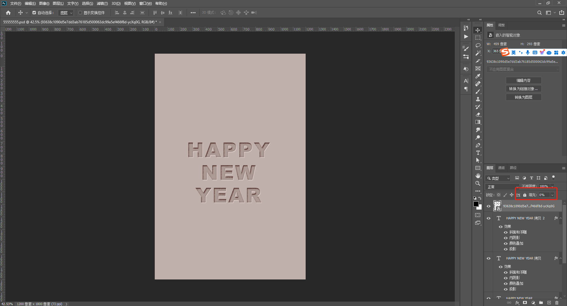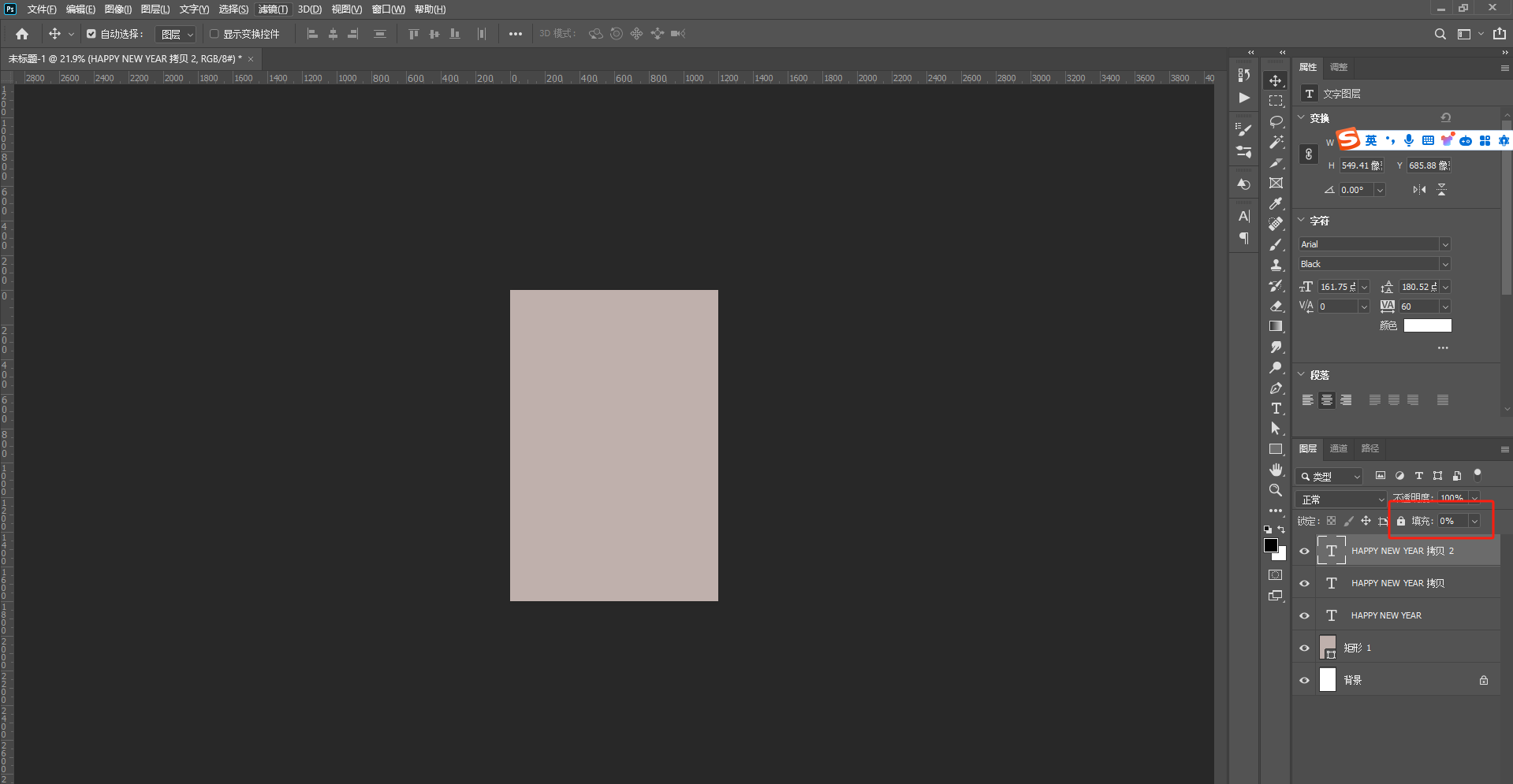 3、将3个文字图层的填充都调至0%