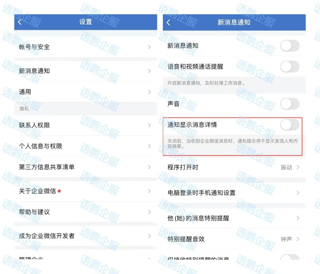 c、关闭“通知显示消息详情”后,重新启用消息免打扰功能即可。