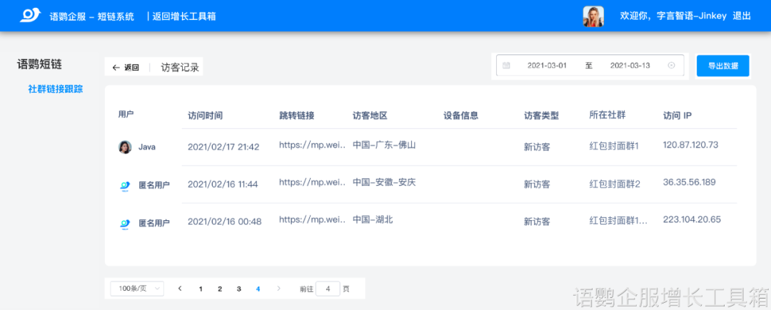 a、使用语鹦企服的「社群链接跟踪」功能,生成跟踪链接或二维码,并将其发送到企业微信外部群中,在语鹦企服私域管家后台实时查看相关链接的点击次数、访问人数和访客记录等信息,清晰地了解到哪些用户已阅读了消息,以及对社群内容的兴趣程度。
