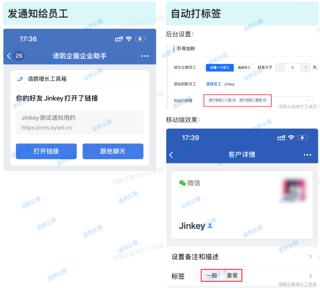 b、使用语鹦企服的「轨迹素材」功能,创建群消息中的领券链接、秒杀链接、引导加微信链接等,能在后台自动统计访问链接的客户。只要客户已读消息并点击链接,就能自动记录其访问情况,支持随时通知用户已读。除此之外「轨迹素材」还支持自动打标签,当客户打开活动链接时就会被自动打上标签,并且针对特定标签的客户,系统还会给员工发送消息提醒,以便后续精准跟进。
