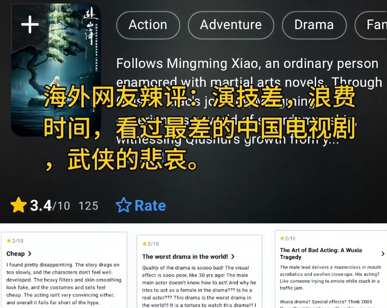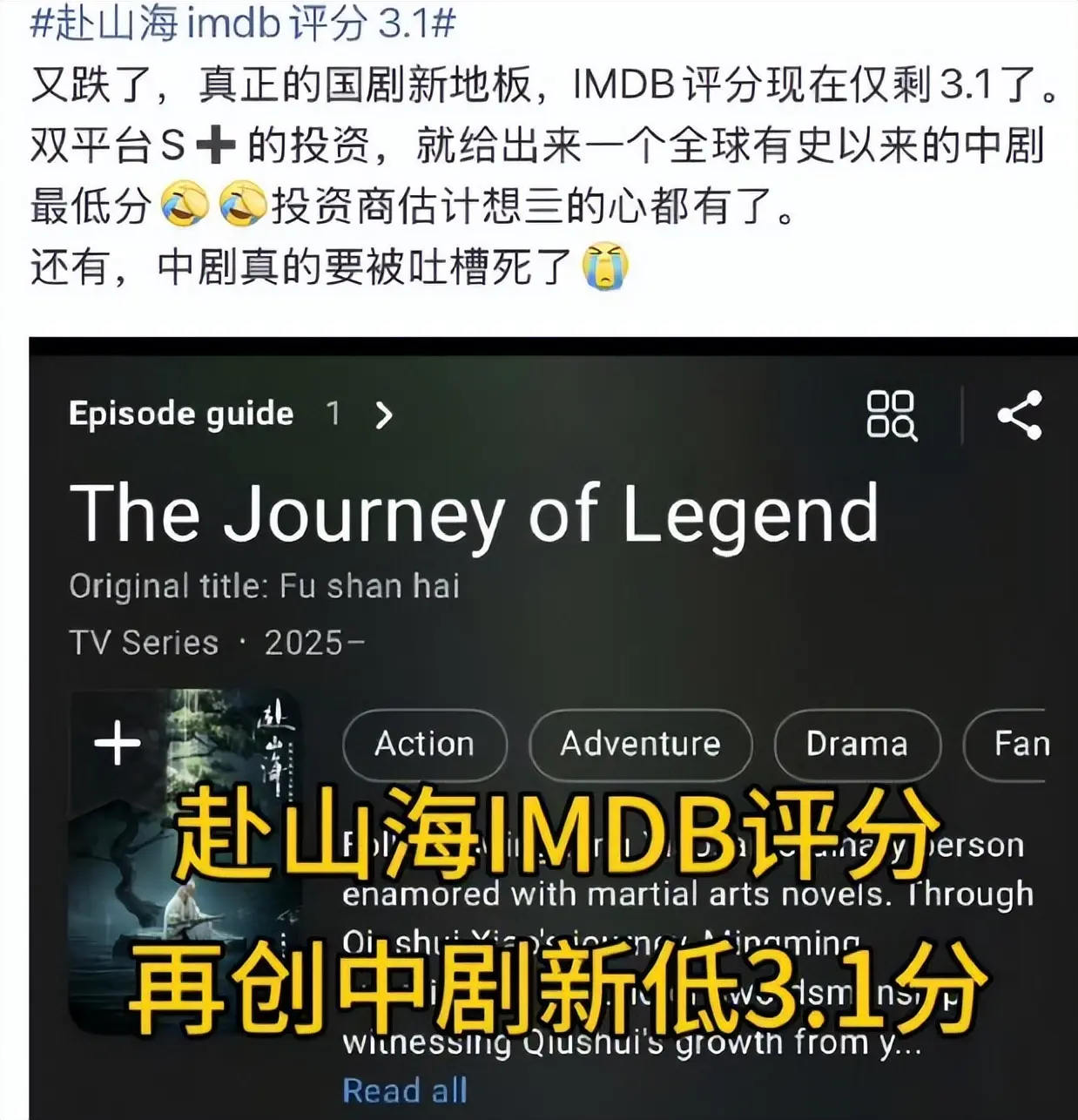 有时,一个剧本应当承担希望,却意外地变成了一个大型翻车场。看《去山海》的争议早就考虑在网络空气中,可没想到IMDB最终取得了3.1的地狱成绩,再度打破国产剧史上的低限。真的不是说玩,这部剧在网上的时候都在想,海报满天飞,S 项目宣传热火朝天,好像非火不可。但观众等待的不是“武侠复兴”,而是遮盖天地的吐槽声。你要问究竟烂在哪儿,那真是一言难尽。