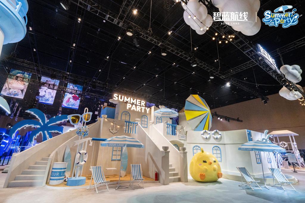 会场整体以蓝色为主色调,但布景风格却又有浓烈的夏日氛围。场馆大概可以分成两块,一边是沙滩、凉亭、安全员瞭望椅,以及一个带风车的小镇街区;另一角,则设计成了科研基地的样子,看起来颇有科幻感。至于主舞台,则设计成了船首甲板的样子。在各个角落以及场馆空中,还挂了多张角色巨幅挂画。