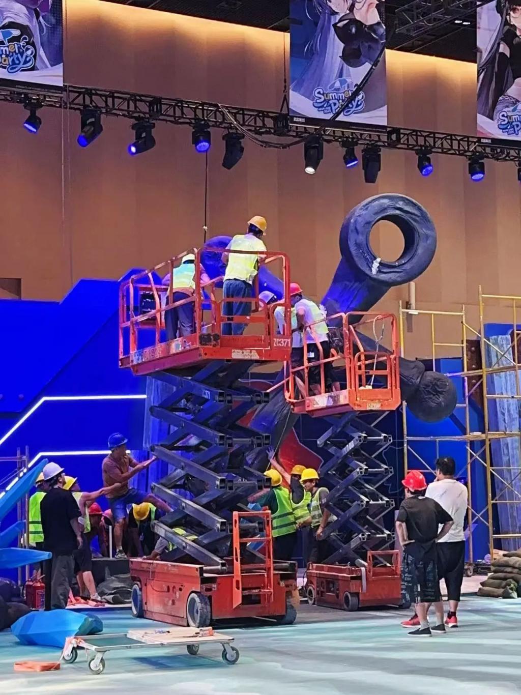 场馆内,各种各样的施工机械停放着,他们动用了两台吊机,还有多个移动升降台。工人们在做最后的收尾工作,有人正忙着为小镇屋子的二楼打磨阳台扶手,还有几个人正合力给一处场景旁竖起 2 米多高的船锚。