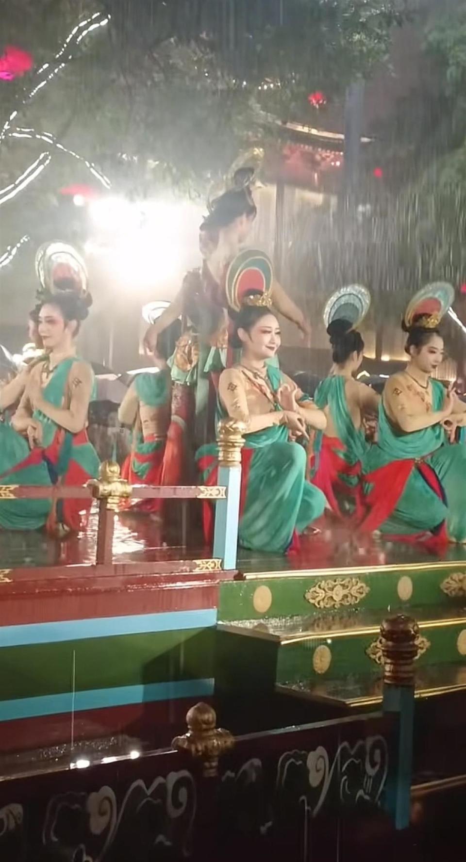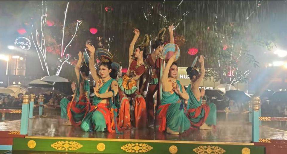 10月14日晚,陕西西安突降大雨,不少网友发布视频称,大唐不夜城正在表演的舞蹈节目《十部伎·敦煌绮梦》并未停演,8位女演员在雨中微笑表演,现场观众也迟迟未散,一齐鼓掌喝彩。