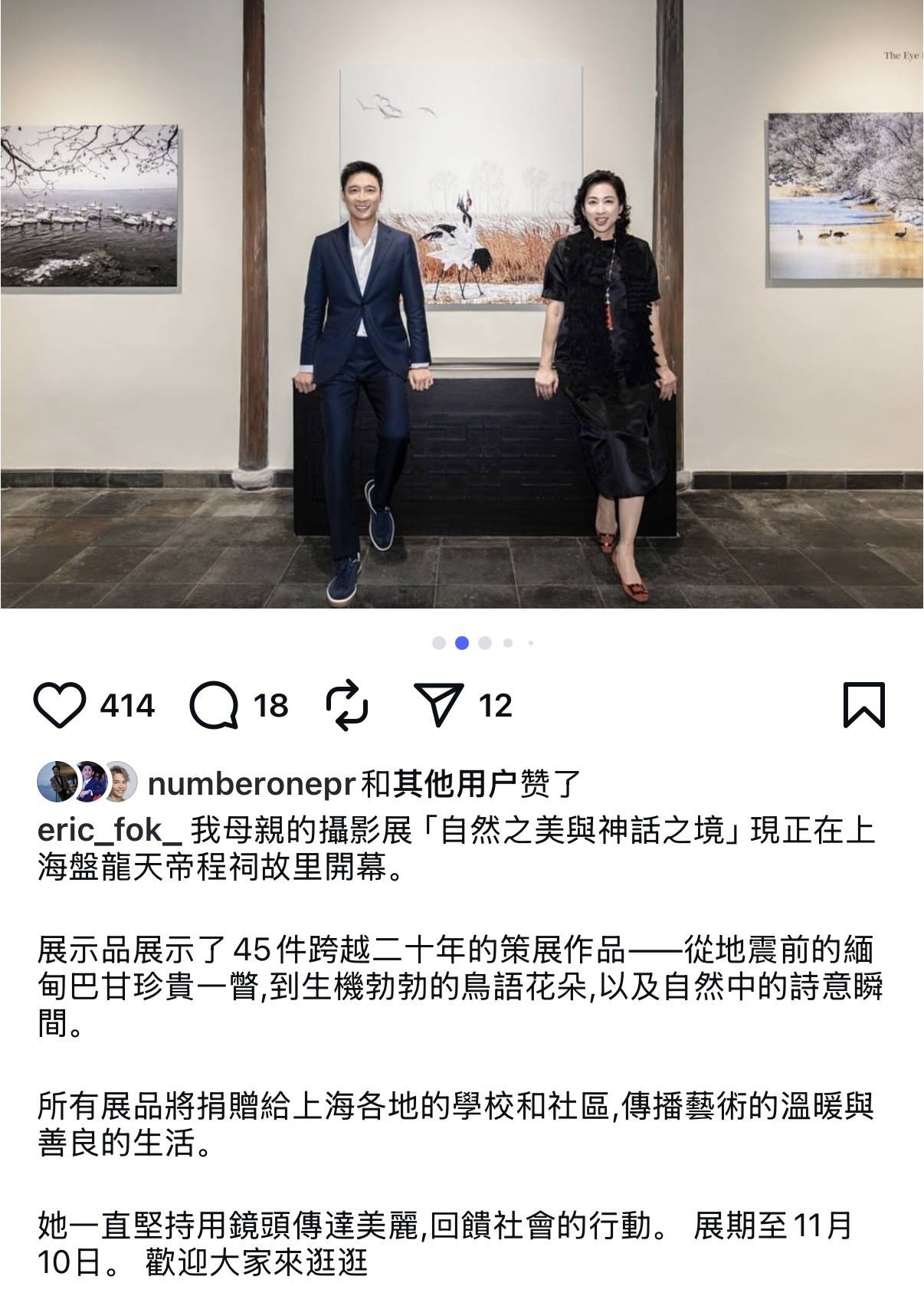 霍启山晒出参加母亲上海个人摄影展的照片,纯粹就是为了母亲的摄影活动宣传,因为展览会一直持续到11月,而晒照就是最好的宣传方式。霍启山是专程前往上海为母亲捧场,他在现场聆听母亲的演讲,在演讲结束后,还陪伴着母亲参观了一遍摄影展,母子俩在展会的不同的角度合照。朱玲玲一身黑色的新中式长裙,胸前还挂了一条吊坠,显得贵气又大方。霍启山身穿休闲西装,高大帅气,只见他的身材挺拔,双腿修长,非常抢镜。母子同框,长得还是神似,可以说霍启山是兄弟中最像朱玲玲的一个。
