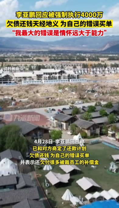 2023年4月28日,针对“李亚鹏被强制执行4000万”的消息,李亚鹏本人发文回应:已和对方商定了还款计划,强制执行是一个常规流程。