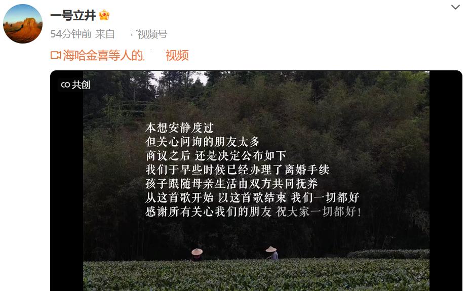他与海哈金喜共创了一段视频,用的是采茶照片作为背景。