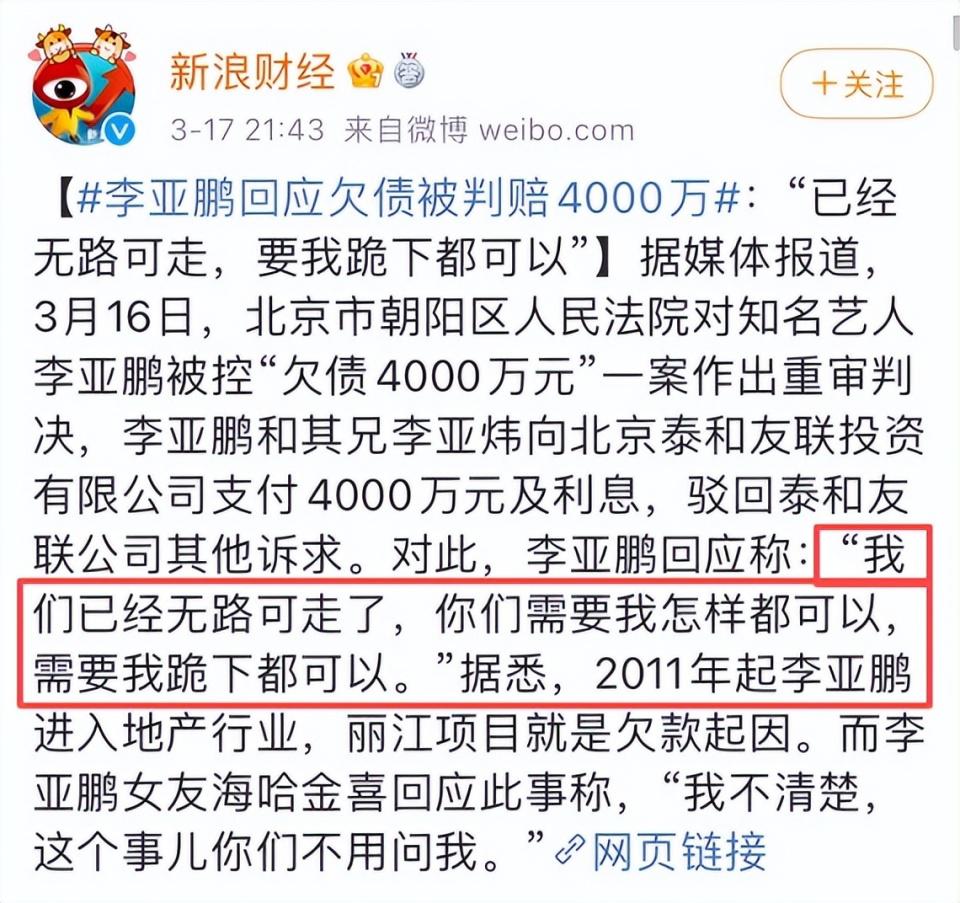 其实俩人官宣生子的下半年,李亚鹏就已经被判欠债 4000 万败诉。