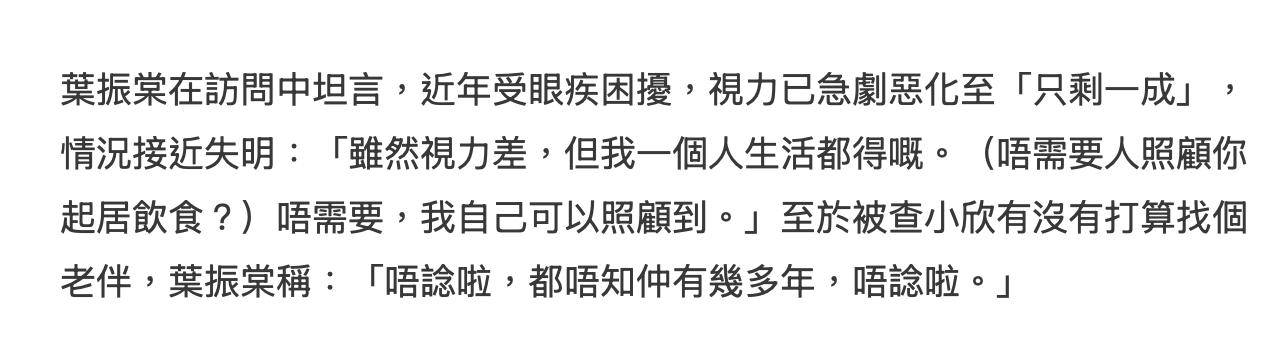 叶振棠已经81岁了,年纪不小了,又患有严重的眼疾,身边没有至亲照顾自己,生活难免孤苦伶仃。查小欣在采访他的时候问及他,有没有打算找个老伴照顾自己。叶振棠直言,已经不会再考虑这些问题了,自己知道自己的事情,都不知道还能活多少年,又何必去连累别人。事实上,叶振棠至今未婚未育,不过她从前是有一个女友的,可惜女友已经病逝了,至今有十年的时间了。