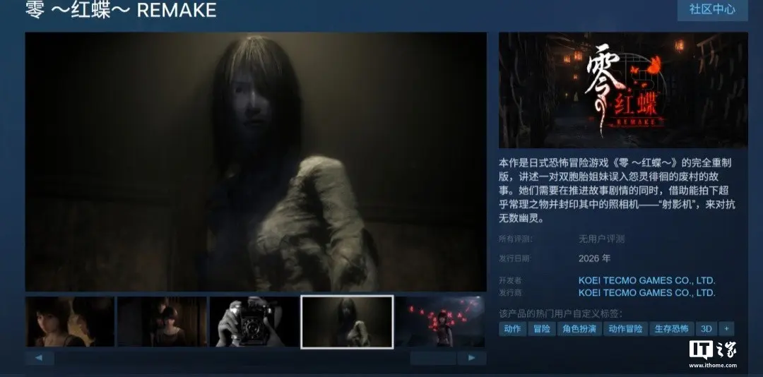 IT之家 9 月 12 日消息,光荣特库摩在今天的 Steam 直面会中公布了《零~红蝶~重制版》,目前其宣布这款游戏除了登陆 Switch 2 外,还将登陆 PC(Steam)、Xbox Series X|S、PS5 平台,目前游戏已上架 Steam,显示将于 2026 年(明年)发售,同时支持简体中文。