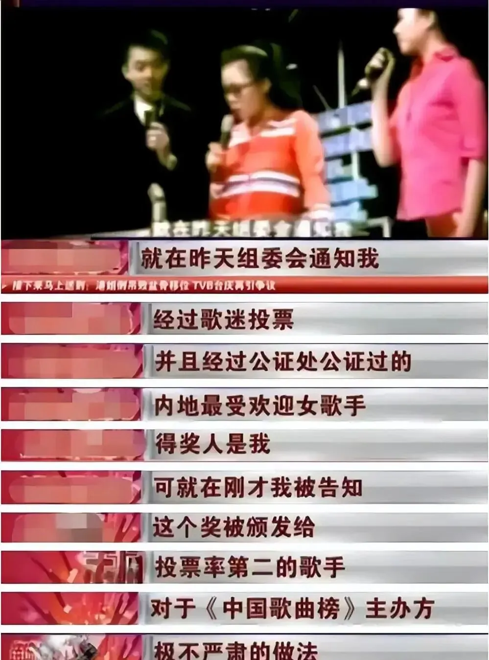让人没想到的是,田震临时协调档期,赶到了现场。看到自己的奖项 “易主”,性格直率的她当场发难:“昨天组委会通知我,经过歌迷投票和公证,‘内地最受欢迎女歌手’是我,可刚刚我被告知,这个奖给了第二名的歌手。主办方这种极不严肃的做法,让我最痛恨,这个奖不领也罢!”