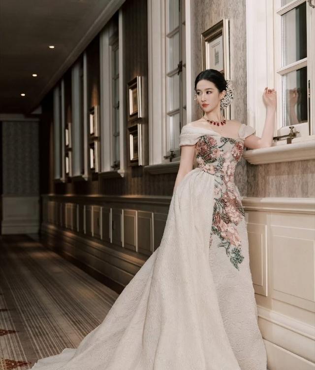 一个穿着Elie Saab 2025秋冬高定礼服,戴着宝格丽红宝石项链,宛如"花中仙子"。