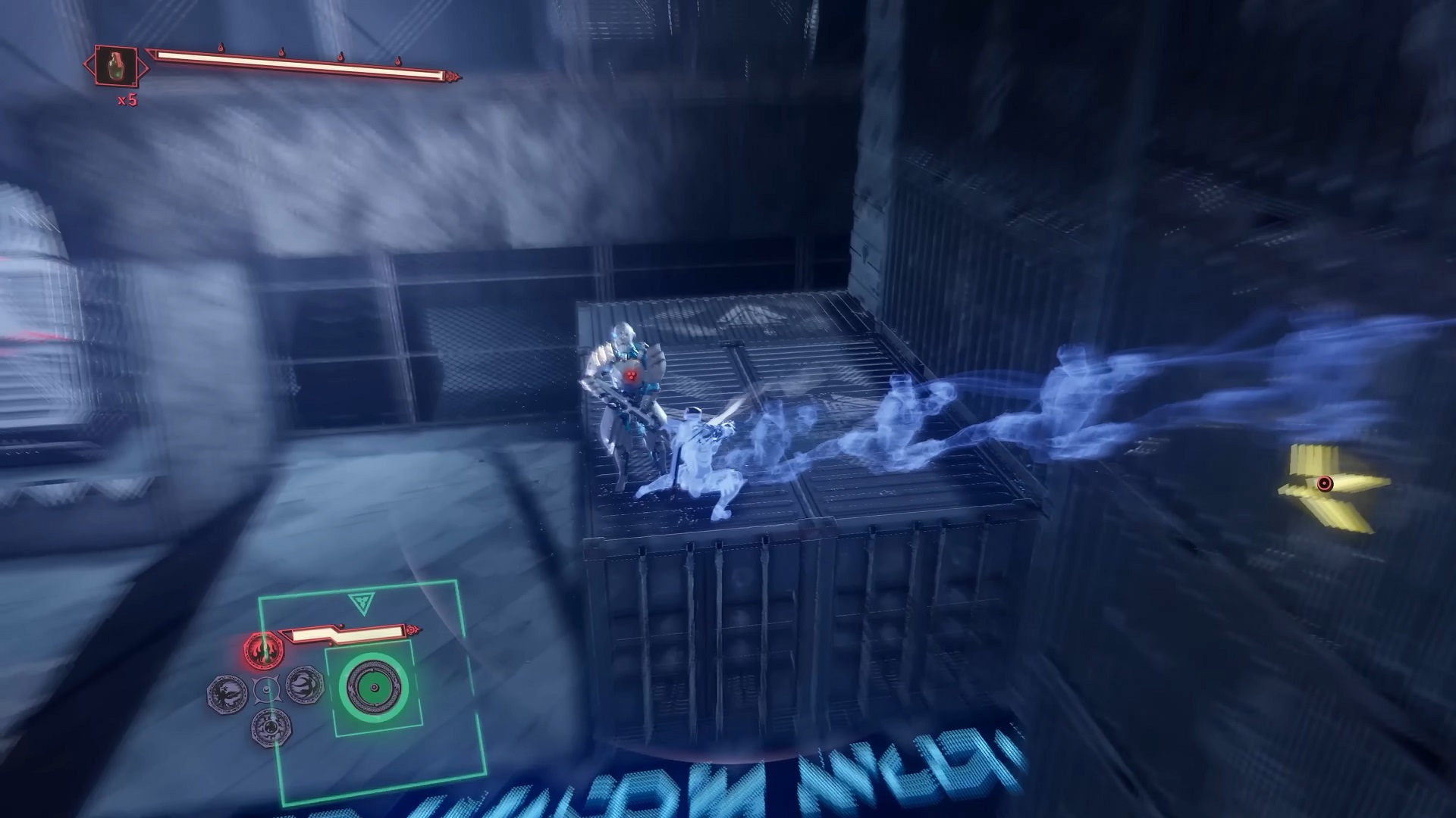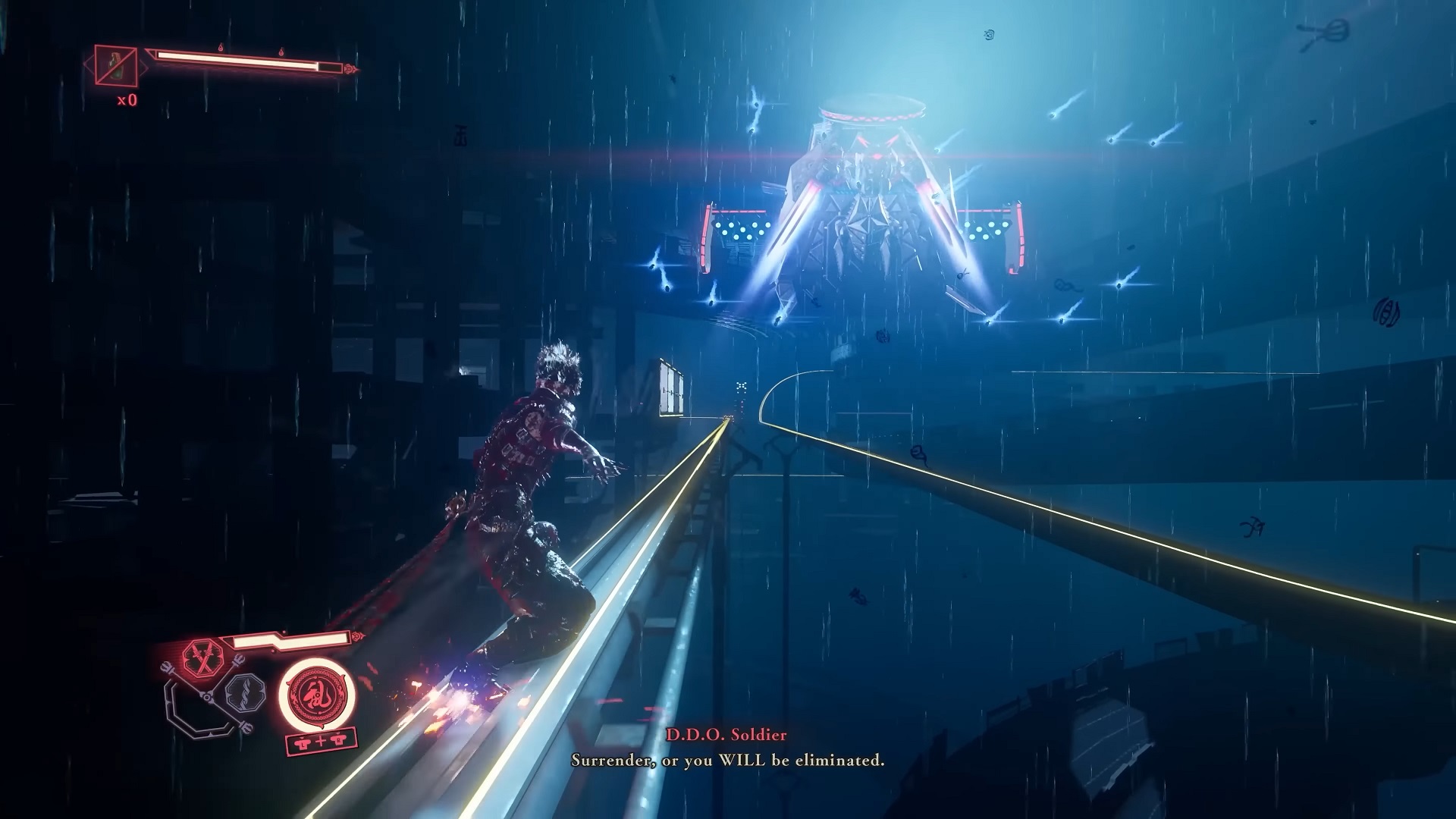 真正能够体现出“白金特色”的地方,是战斗间隙的一些很放飞的环节。比如有一段就像是恶魔版的 3D《索尼克》关卡 —— 我一边以违反物理法则的方式在轨道之间跳跃,一边躲避直升机的射击,我需要用抓钩从轨道跳到另外一条轨道,再跳到墙上,然后再跳回轨道,最后高高跃起,完成一次非常有张力的俯冲暗杀,从而开启下一场战斗。