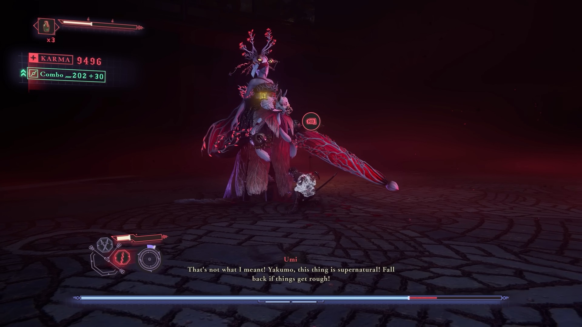 该形态主要用于在敌人可以格挡你的普通攻击时击溃敌人的防御,或者用于抵御大型敌人和 Boss 的闪红光超强攻击。八云的“奴延鸟”形态会召唤出一把可以延展的巨大血剑,可进行大范围 AOE 攻击,看上去很酷;而隼龙的“闪华”形态则可以使用平时只有蓄力必杀才能打出的多段高速斩击。