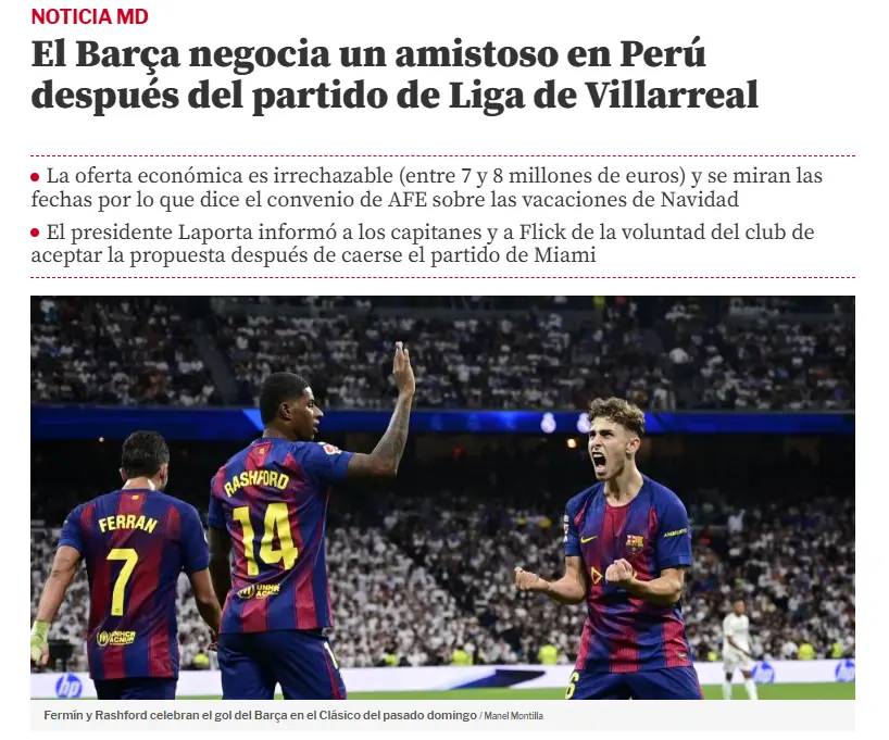对财政压力巨大的巴萨来说,赚钱总是很重要的事情。10月29日,《世界体育报》透露,巴萨计划在圣诞节前飞赴秘鲁,进行1场商业赛,这能给巴萨带来700万-800万欧元的出场费。巴萨主席拉波尔塔已经与4大队长、体育总监德科、主帅弗里克开会,准备接受邀请。
