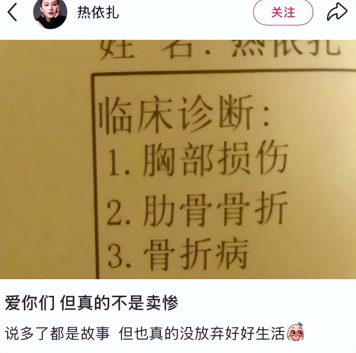 她曾公开过自己的身体状况,病历显示,胸部损伤、肋骨骨折、骨折病。