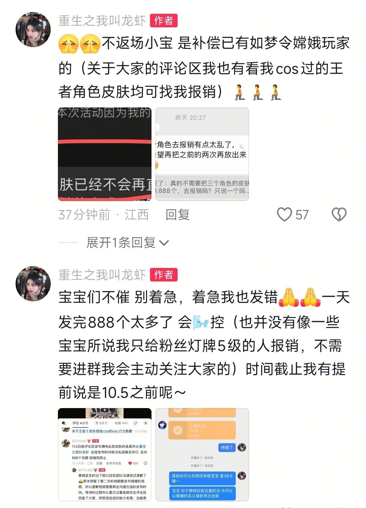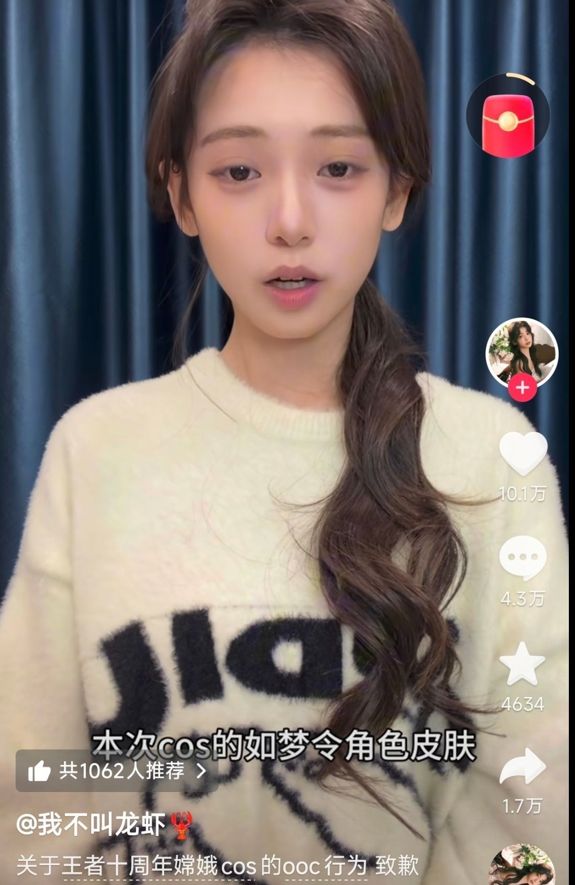 10月28日,该博主发布道歉视频,承认其行为“严重OOC”(脱离角色设定),并向嫦娥玩家及官方致歉。她宣布不收取本次活动费用,并承诺为888名嫦娥玩家报销“如梦令”皮肤(价值888点券),总补偿金额约7.8万元。