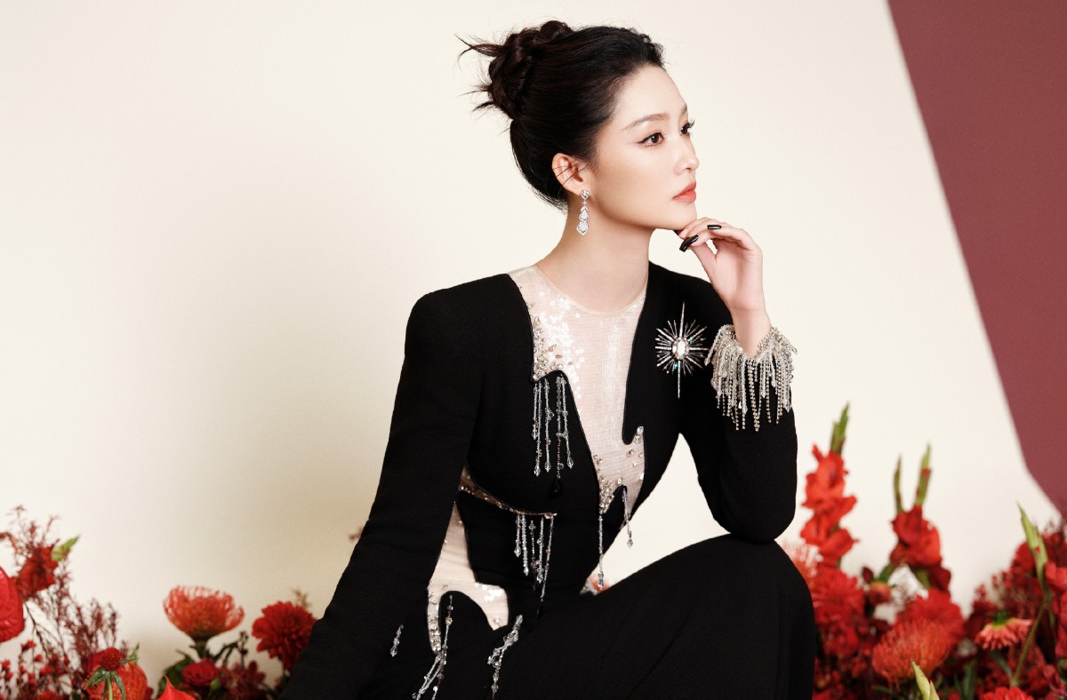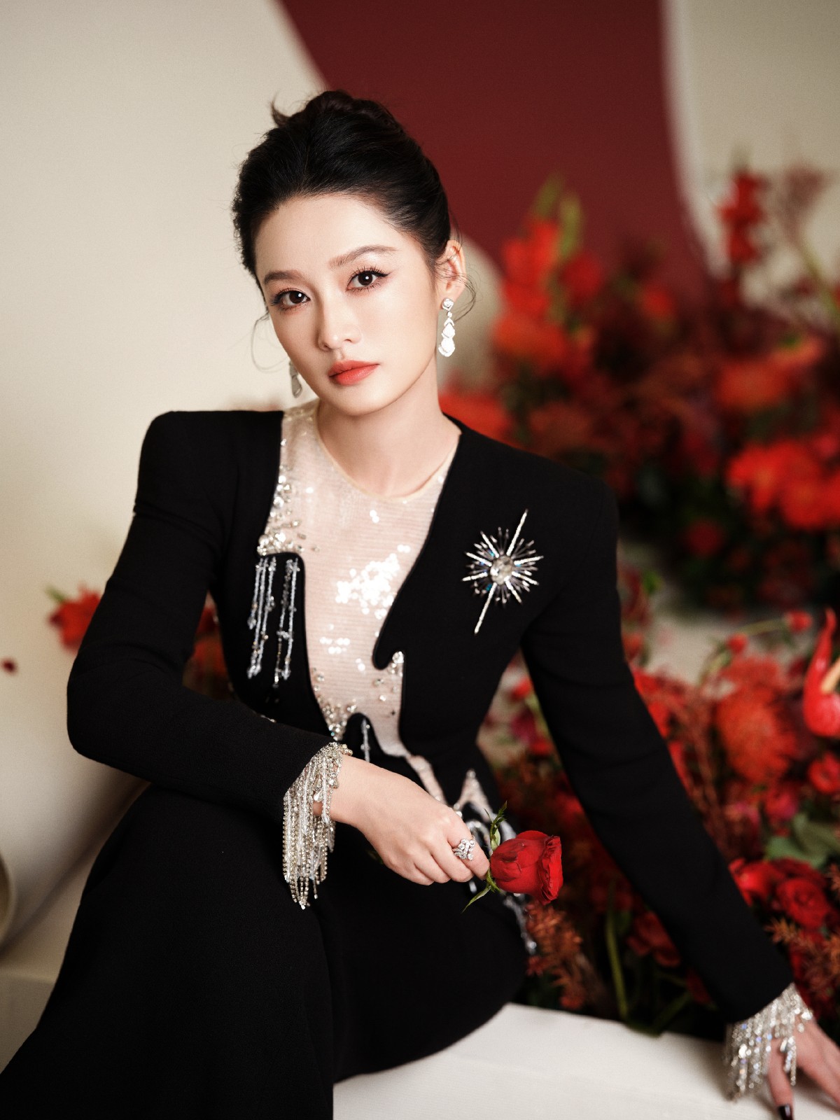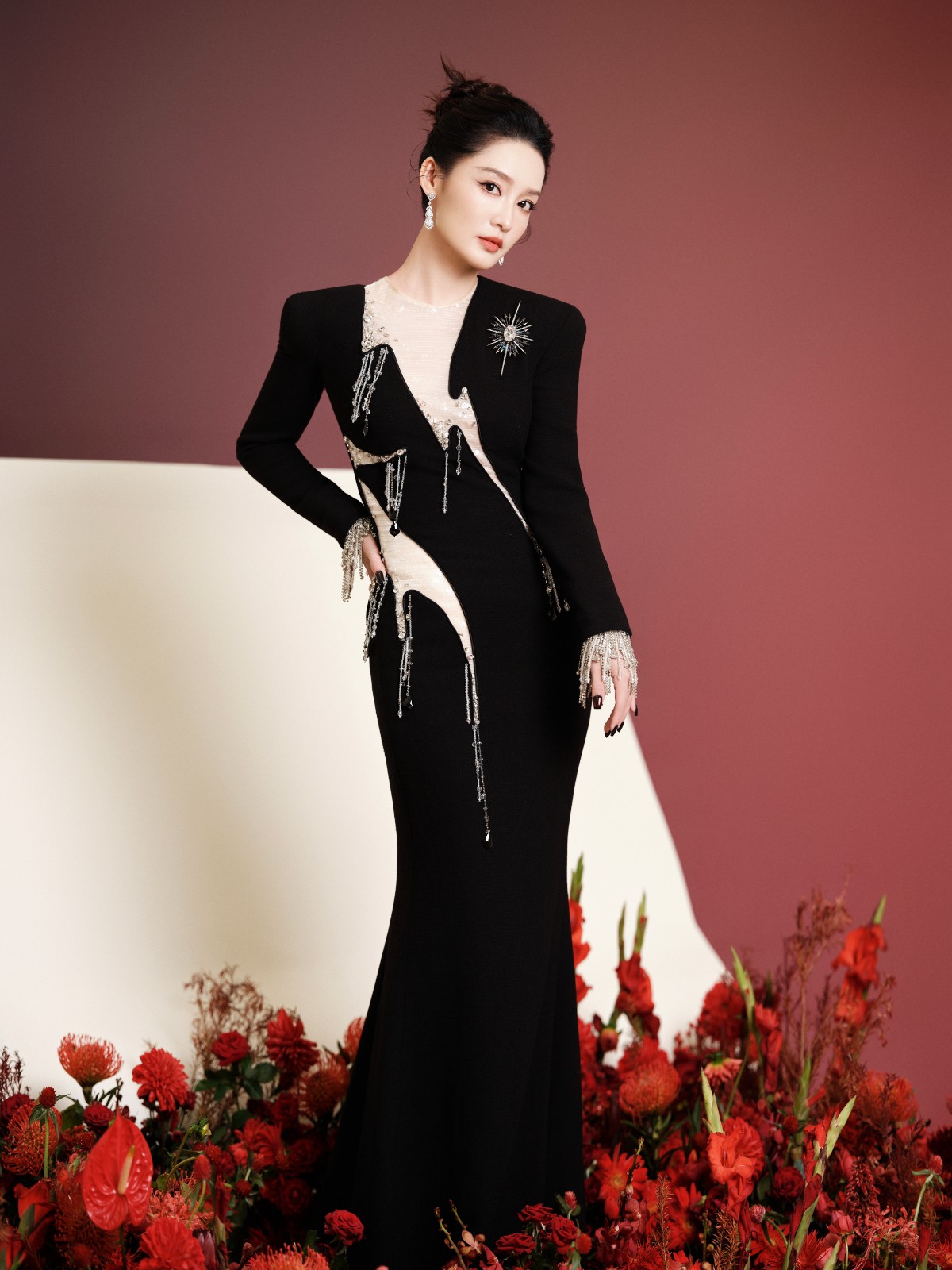 当大片的红色花艺如炽烈火焰在镜头前肆意铺展,李沁身着一袭解构主义黑色礼服于花海中从容伫立,瞬间成为视觉与时尚的双重焦点。那并非单调的黑色,礼服上银色流苏似星河碎落,星芒胸针如暗夜辰光,亮片与哑光面料的碰撞恰似优雅与摩登的精彩对话,每一处针脚都镌刻着高级定制的匠心巧思。高盘发将天鹅颈线完美勾勒,耳畔珠宝耳饰随姿态轻晃,与袖口流苏银饰遥相呼应,在光影交错里漾开层层精致涟漪——这般妆造,让她在热烈与冷艳的风格边界,走出了独属于李沁的灵动步调,每一个镜头定格,都是时尚与艺术的绝美联姻。