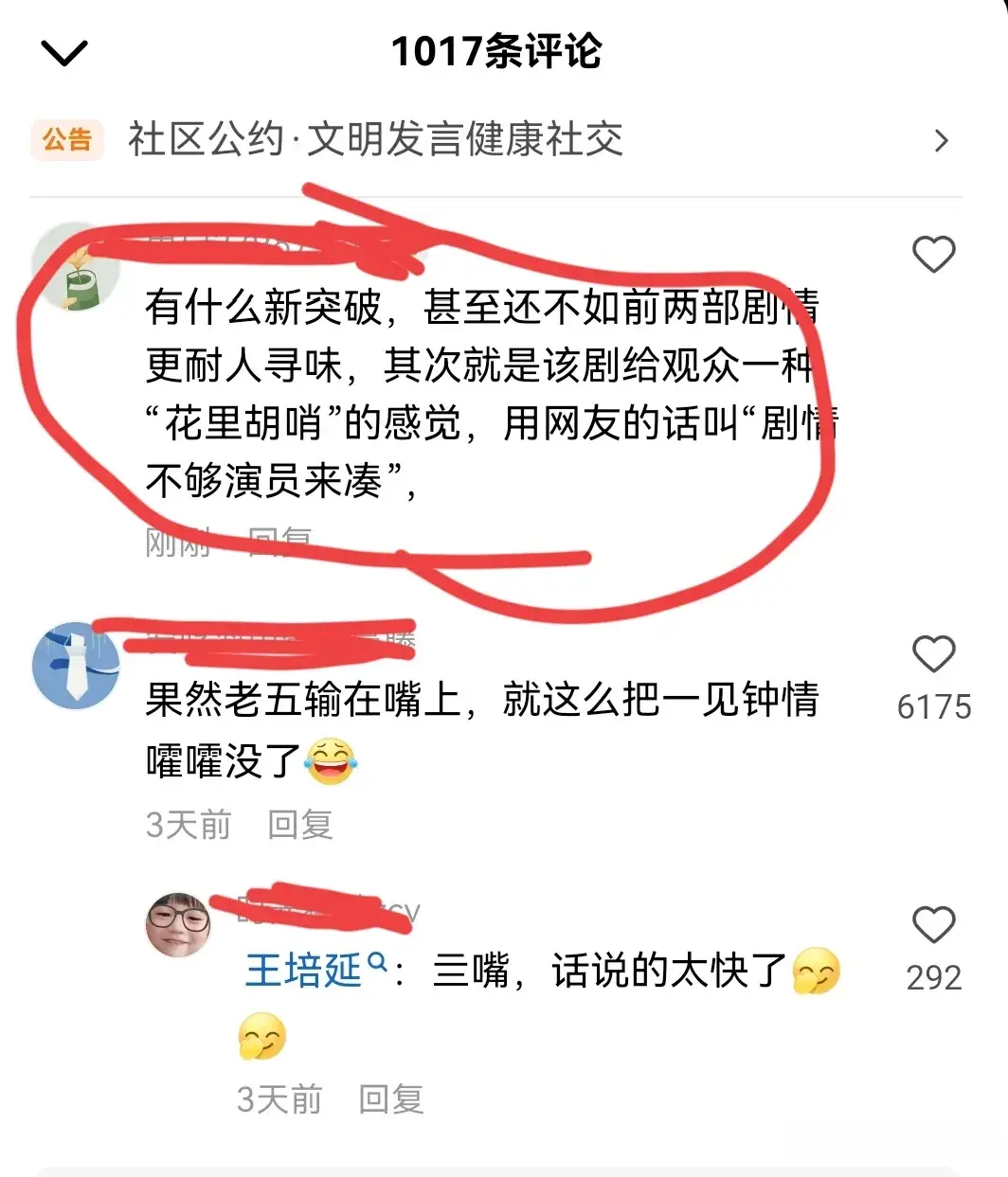 为何出现这种现象呢?评论区网友的话一针见血, 网友认为《太奶奶3》的剧情没有什么新突破,甚至还不如前两部剧情更耐人寻味,其次就是该剧给观众一种“花里胡哨”的感觉,用网友的话叫“剧情不够演员来凑”,