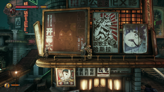 《暗影火炬城》“柴油朋克”世界带有一点法国漫画幻想风格, 整体“气质”上非常接近之前SCEJ的《重力眩晕》里那种充满趣味性的童话风格,整个火炬城以上海老弄堂为灵感,有非常多的上海本土文化元素与中国文化元素融入其中,比如街头的老上海月份牌海报,留声机、街头小贩、老上海歌舞厅、甚至是弄堂里的公厕等等细节,让整个火炬城在脏旧杂乱的同时,充满了各种小细节与蓬勃的生活气息。另外,老弄堂与整个“柴油科技”驱动的城市风格融合非常和谐,画面的色彩色调也采用了偏电影感的低对比低饱和度风格,场景的氛围营造也很到位。