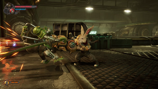 游戏采用轻重键+组合键的方式进行攻击,配合高速冲刺和二段跳,移动和战斗的节奏很快。游戏的主角兔子雷德文有三种武器可以切换,机械铁拳、机械钻头和闪电鞭,每种武器都有十种左右的技能可以学习,学习完武器技能后,通过组合键就能打出丰富的连段。不仅如此,当敌人的血量很低时,我们也有一定几率触发终结技能,这时候镜头会给到近距离特写,演出效果很不错。