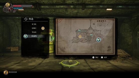 与《恶魔城》那种全开方式完全靠玩家自己探索地图的玩法不同,《暗影火炬城》在地图菜单中可以按三角键呼出地图提示图标,图标上不仅表示出了各关键位置的名称及坐标,也有用红色感叹号(❗)标识出当前需要完成的任务,避免了盲目在地图中来回探索的情况,对新手非常友好。