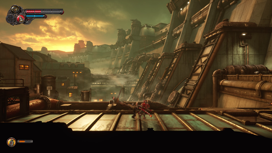 《暗影火炬城》采用虚幻引擎4进行制作,因此游戏的画面表现自然是银河恶魔城类游戏中的佼佼者,虽然是一款横版游戏,但是火炬城的远景建筑并不马虎,无论地铁站、歌舞厅还是楼顶天台等,全部火炬城的建筑都采用了全三维模型制作,场景制作规模完全不亚于一款第三人称3D动作游戏,宽广的视角和远景建筑,给游戏带来丰富的纵深层次感。