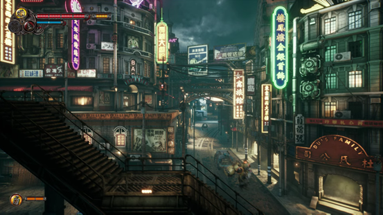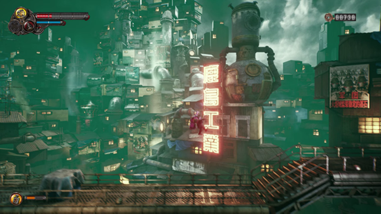 《暗影火炬城》“柴油朋克”世界带有一点法国漫画幻想风格, 整体“气质”上非常接近之前SCEJ的《重力眩晕》里那种充满趣味性的童话风格,整个火炬城以上海老弄堂为灵感,有非常多的上海本土文化元素与中国文化元素融入其中,比如街头的老上海月份牌海报,留声机、街头小贩、老上海歌舞厅、甚至是弄堂里的公厕等等细节,让整个火炬城在脏旧杂乱的同时,充满了各种小细节与蓬勃的生活气息。另外,老弄堂与整个“柴油科技”驱动的城市风格融合非常和谐,画面的色彩色调也采用了偏电影感的低对比低饱和度风格,场景的氛围营造也很到位。