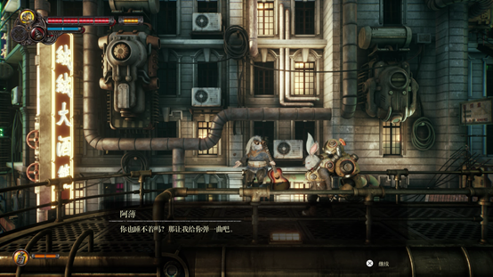游戏采用轻重键+组合键的方式进行攻击,配合高速冲刺和二段跳,移动和战斗的节奏很快。游戏的主角兔子雷德文有三种武器可以切换,机械铁拳、机械钻头和闪电鞭,每种武器都有十种左右的技能可以学习,学习完武器技能后,通过组合键就能打出丰富的连段。不仅如此,当敌人的血量很低时,我们也有一定几率触发终结技能,这时候镜头会给到近距离特写,演出效果很不错。