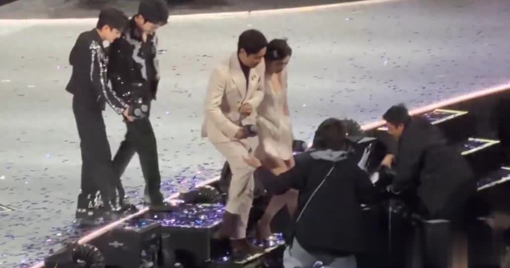 旁边的周深想要去扶着杨幂,沈腾却拦住了。