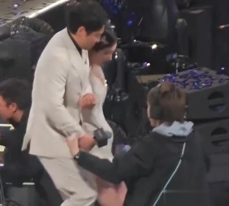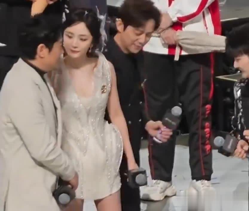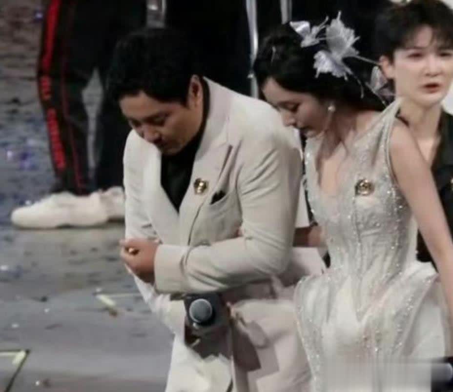 这也导致现场出现了非常滑稽的一幕,那就是沈腾扶着杨幂,而另一只手被工作人员扶着。