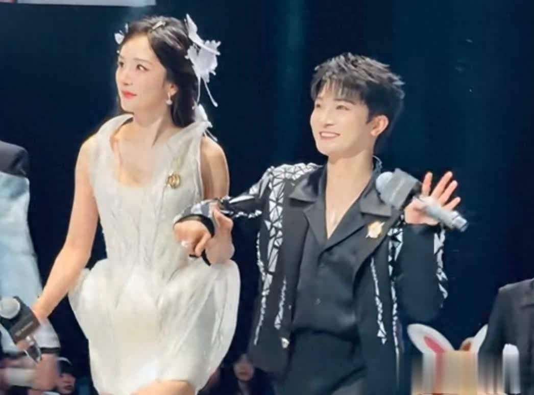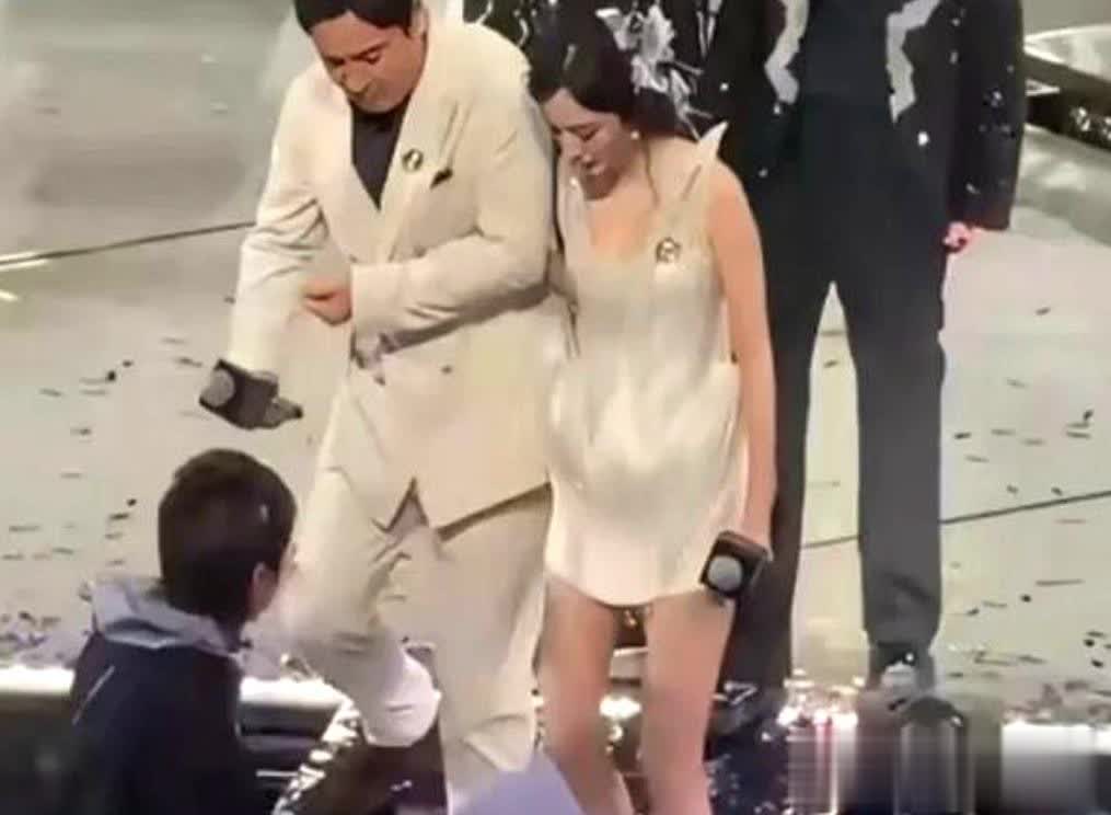 嘴里还嘟嘟囔囔说着什么,一旁的杨幂也有些意外,但当时已经准备退场了,场面比较混乱,杨幂也只好跟着沈腾一起走。