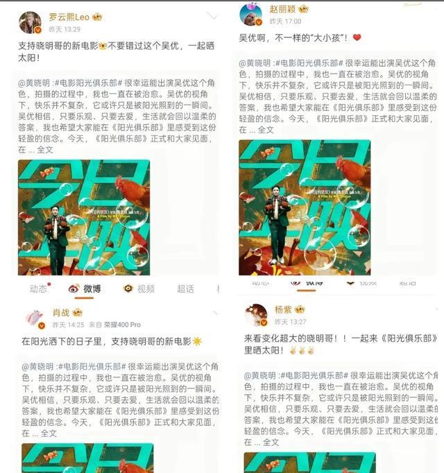 面对票房失利,粉丝和片方将原因归结于宣发不力。黄晓明为《阳光俱乐部》的宣发是甩开老脸了,发动娱乐圈的诸位顶流好友,肖战、赵丽颖、刘亦菲等人在社交媒体上轮番造势,相关话题阅读量轻松过亿。甚至还打出了亲情牌,放出儿子小海绵探班的温馨视频,试图拉动关注。
