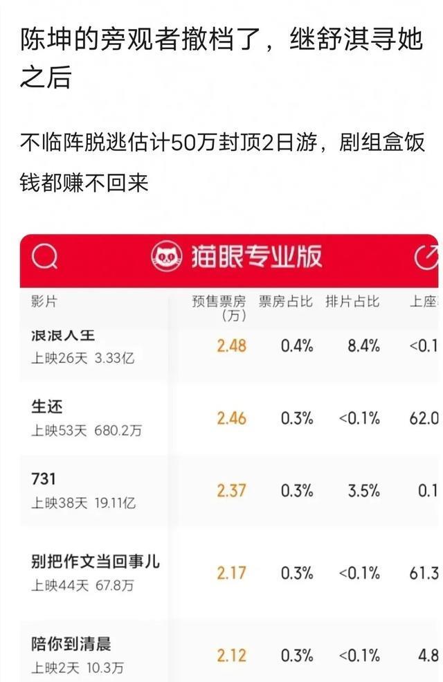 老对家陈坤的处境更为尴尬,新片《旁观者》甚至连正式上映的勇气都没有,因为点映和预售总票房还不到4万元,首日排片占比低至可悲的0.3%,最终片方紧急撤档以求日后生机。