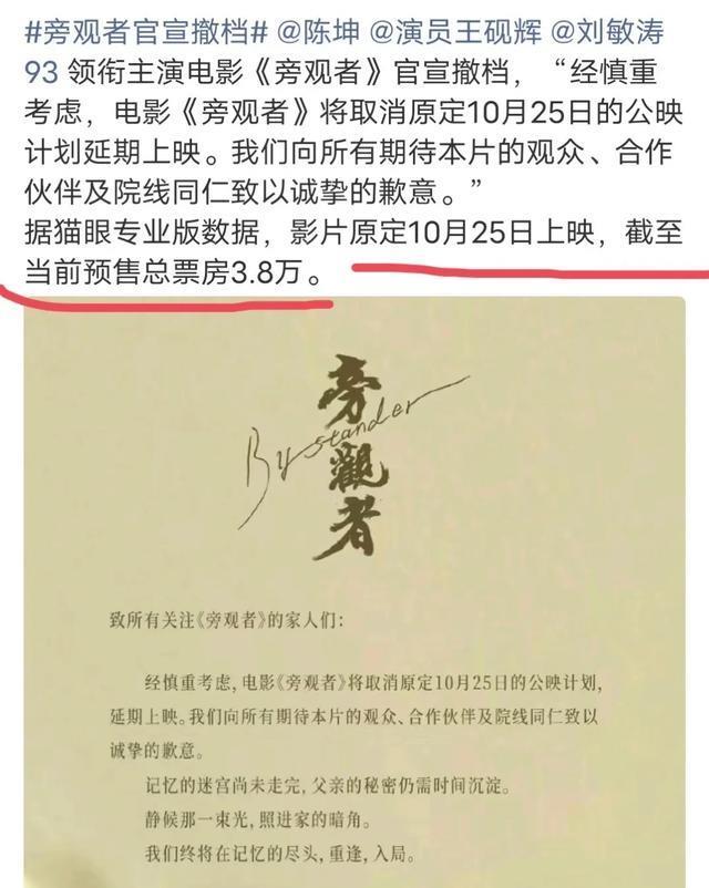 另一边,陈坤的《旁观者》倒是几乎零宣发。定档后没有路演,没有大规模的媒体投放,社交平台悄无声息,发行公司也缺乏商业院线资源,导致很多观众根本不知道这部电影上映了。粉丝这两天都炸锅了,认为如果宣传给力,结果必定不同。但仔细看看,就算陈坤和黄晓明一样卖力宣传,最终都指向了同一个结局,失败。