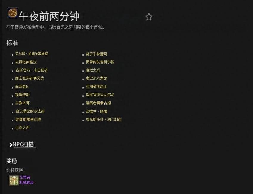 这次前夕活动已经确定会有一个新的成就——“距离午夜仅剩两分钟”。完成方式是前往暮光群岛,击败由暮光之刃召唤出的所有首领。成就的描述中提到的是“前夕活动”之一,这说明暮光事件可能只是整个活动线的一部分。