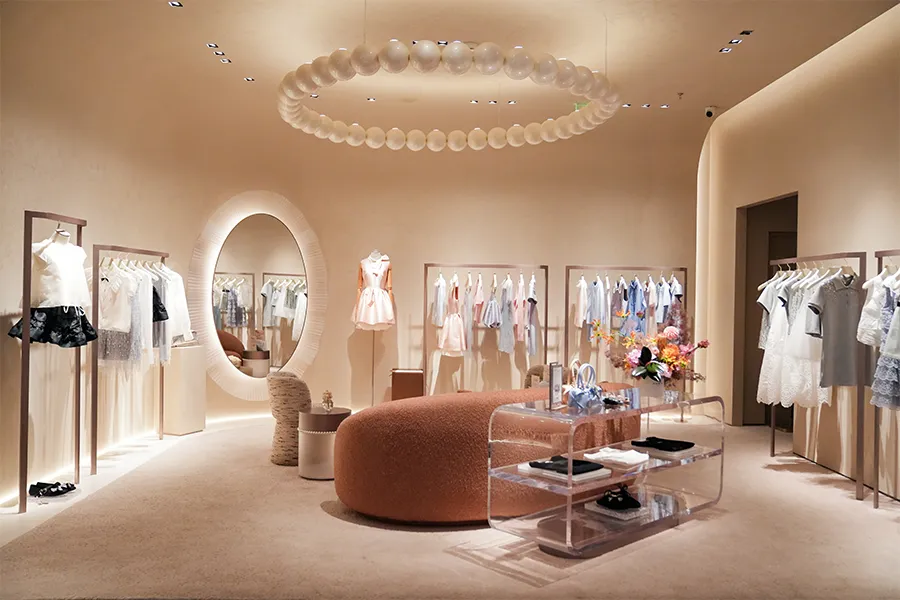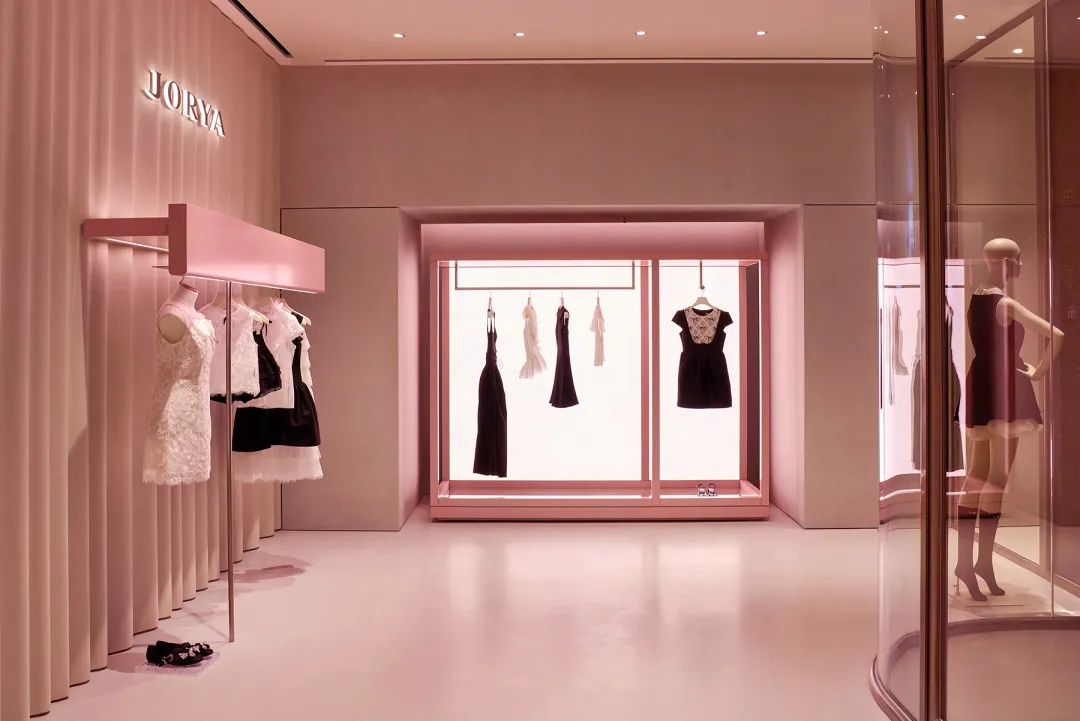 走进JORYA门店,会发现其门店装修色彩以低饱和度的裸粉、米白和香槟金为主,暖黄色灯光笼罩,每一件成衣都透着精致的公主感。与快时尚门店不同,这里没有过多的促销元素,更像是一个为追求优雅穿搭的消费者打造的“美学空间”。