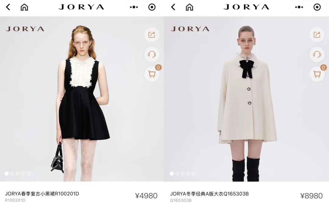据母公司欣贺股份财报,JORYA价格带在2000元至6万元之间。例如,其代表性的JORYA春季复古小黑裙定价4980元,JORYA冬季经典A版大衣定价8980元。