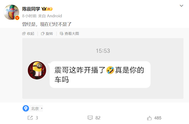 30日下午,有网友私信陈震询问直播间里的车是否他的车,他回复,曾经是,现在不是了。