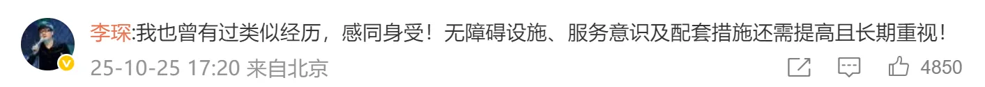 随后,《窗外》原唱歌手李琛在评论区留言表示:我也曾有过类似经历,感同身受!无障碍设施、服务意识及配套措施还需提高且长期重视!